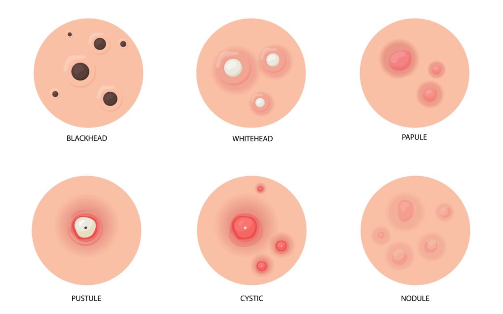 - whiteheads – plugged pores with white tops